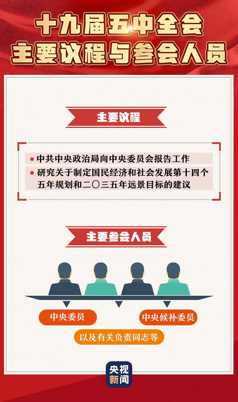 中国共产党第十九届中央委员会第五次全体会议26日上午在京召开。中央委员会总书记习近平代表中央政治局向全会作工作报告,并就《中共中央关于制定国民经济和社会发展第十四个五年规划和二〇三五年远景目标的建议(讨论稿)》向全会作了说明。