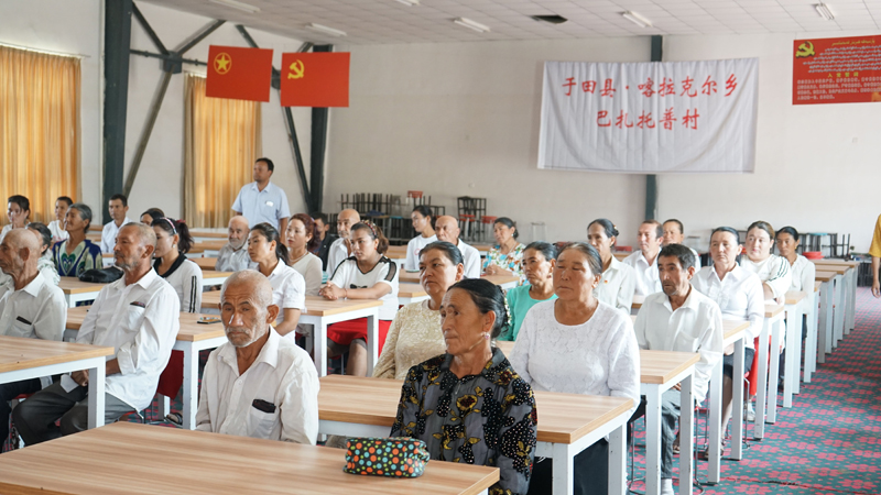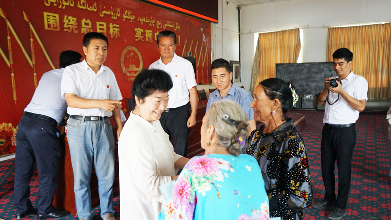 离开假发厂后,李书记直接来到定点帮扶村——喀尔克乡巴扎托普村。村民们得知李书记要来看望大家,高兴的早早地就等候在村民服务中心,当李书记一行进入大厅时,响起长时间的掌声,每年的肉孜节、古尔邦节李书记都来看望村民,他们已把李书记当成了最亲的人。